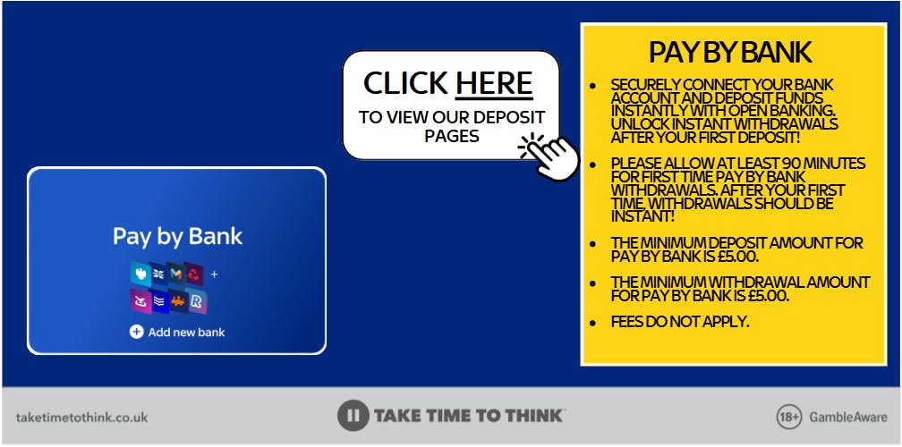 Start by depositing using Pay by Bank now by visiting the 'Deposits' page.